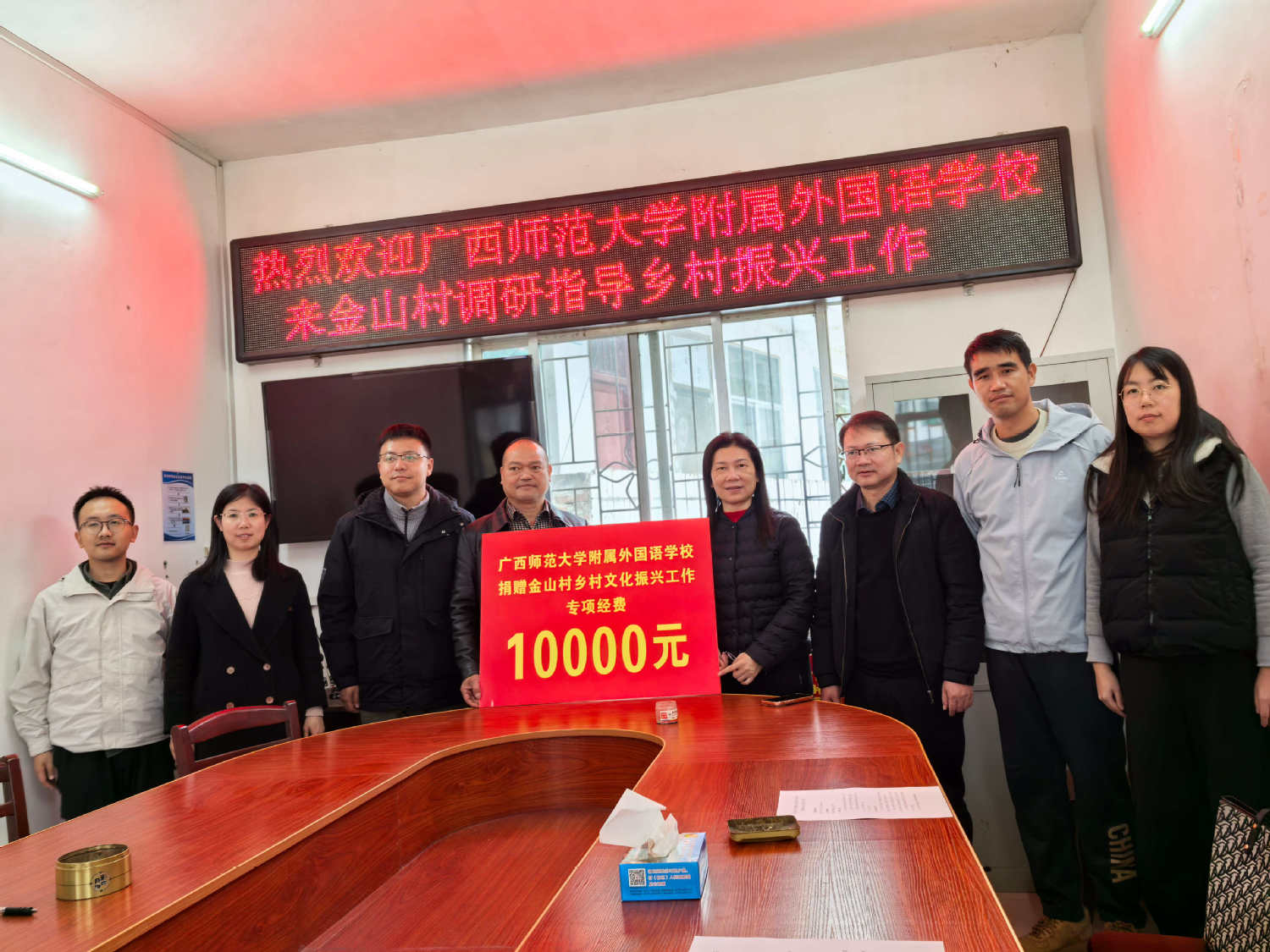在调研座谈会上,广西师范大学驻金山村第一书记汇报了驻村情况,金山村基层党支部书记介绍了金山村的基本情况、发展现状与现存需求。附属外国语学校党委负责人在座谈会上表示,希望能充分发挥学校的优势,为村里的孩子们提供优质教育教学资源,通过多种形式,加强校地沟通联系,全面助力乡村教育发展。最后,附属外国语学校向金山村捐赠乡村振兴专项基金经费一万元,用于金山村文化振兴。