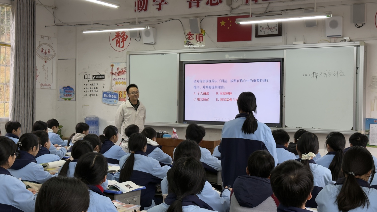 附属外国语学校廖老师在资源镇初中为八年级学生带来一堂生动的道德与法治课。廖老师设计贴近学生生活的情境,通过提问引导学生辨得失、明是非,让学生在理解个人利益与国家利益的关系中,将爱国情怀融入日常生活。课堂上,学生因熟悉的情境主动发言,气氛活跃,获得在场老师的一致好评。
